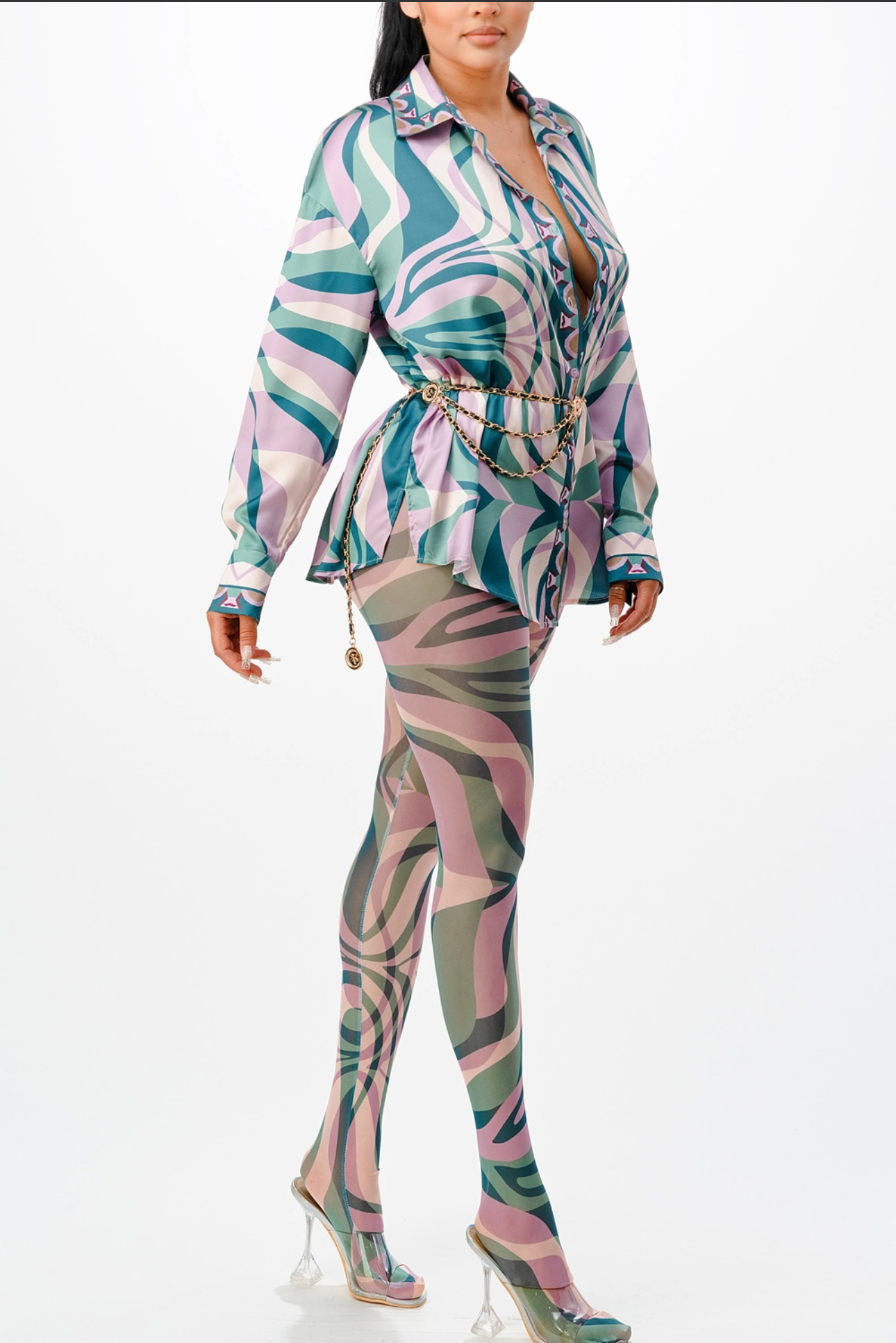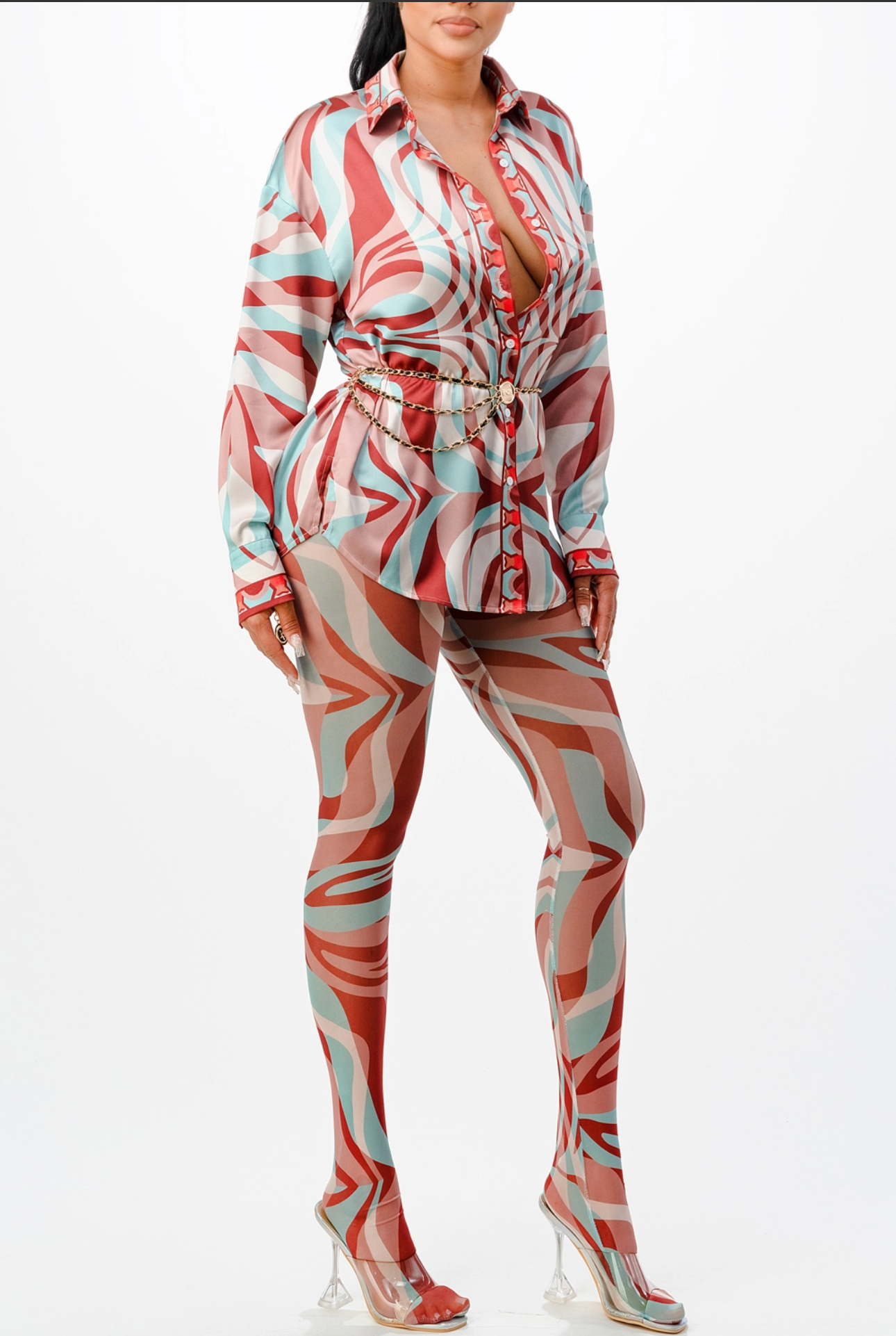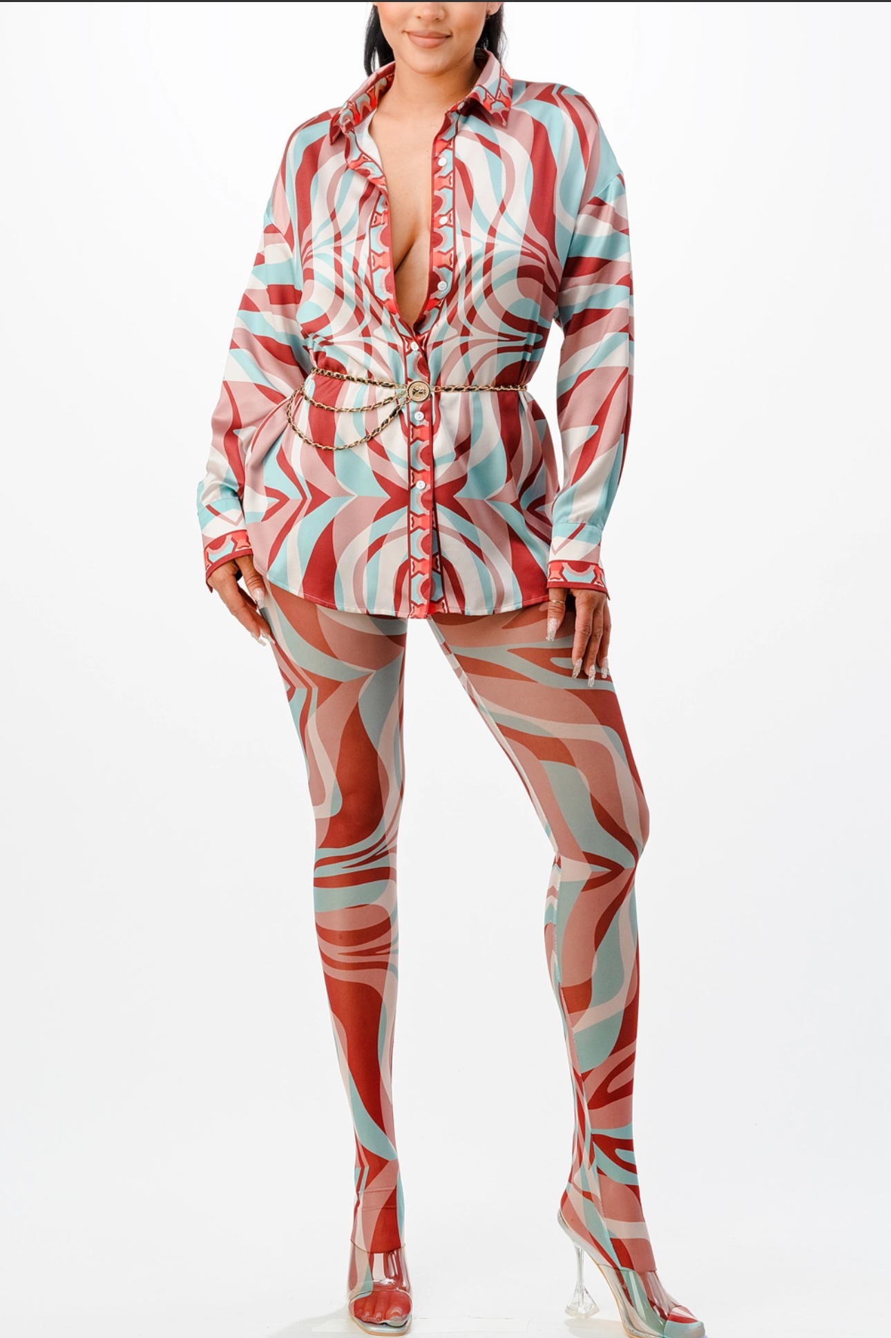 -Top- *Placement scarf printed *Satin Button-down Blouse *Long Sleeve with placement scar print.