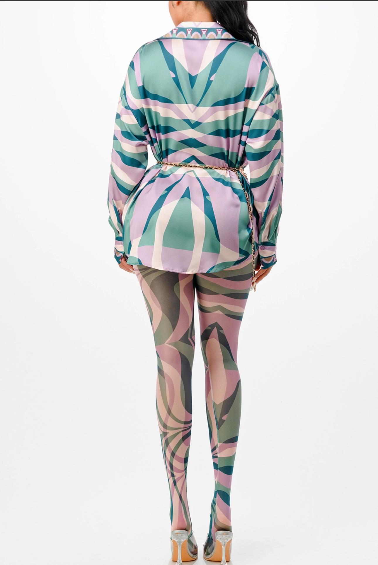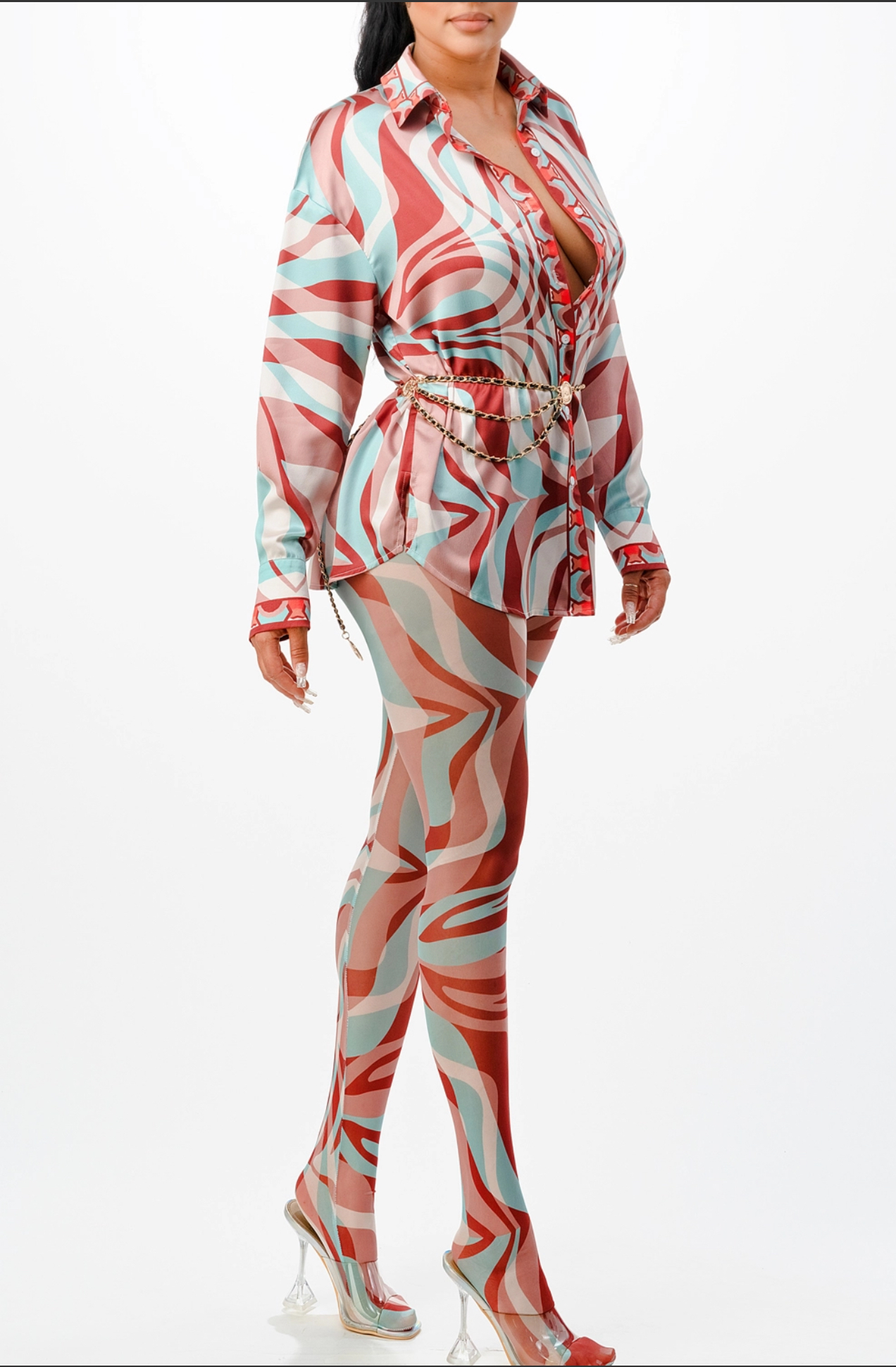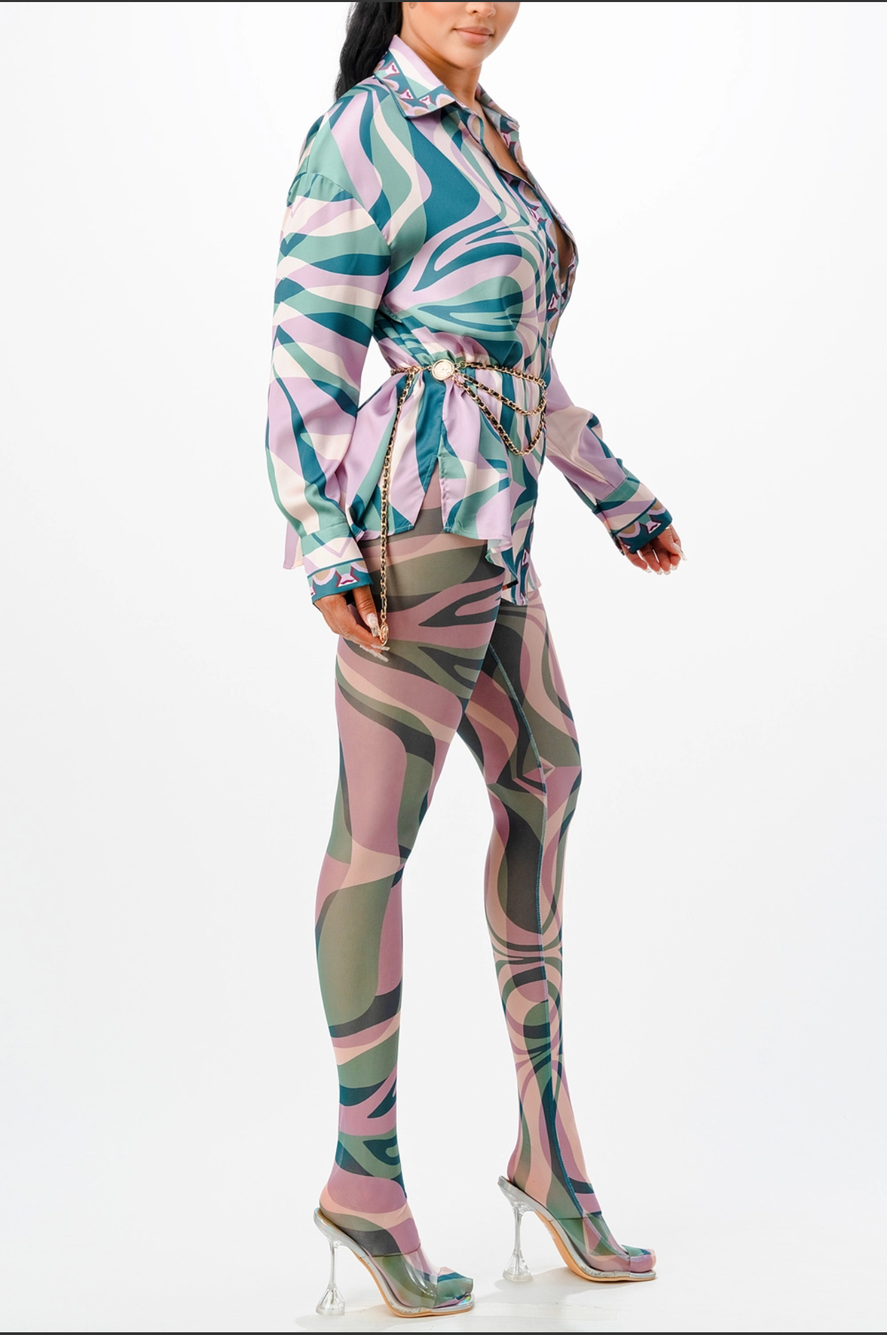 -Top- *Placement scarf printed *Satin Button-down Blouse *Long Sleeve with placement scar print.